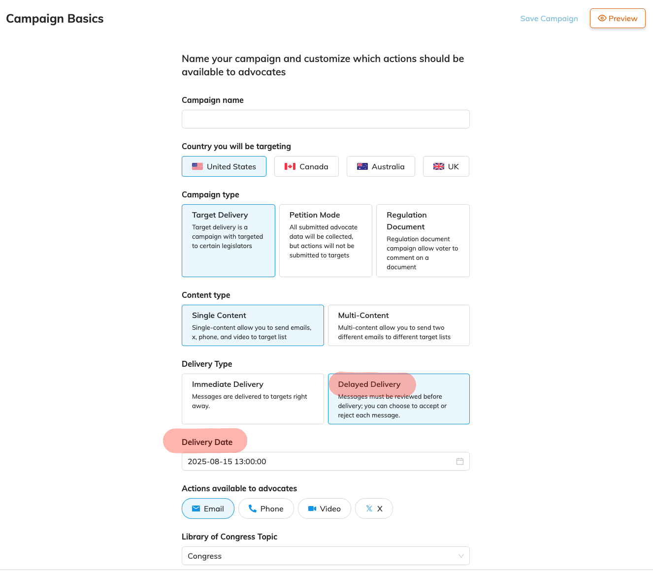 To create a Delayed Campaign: It's the same as any other campaign. You just have to select the Delivery Date. Which means you will capture signatures from your advocates and deliver them on in a single day. If you would like to know more about our consulting services to help set these up. Please reach out to sales@oneclickpolitics.com