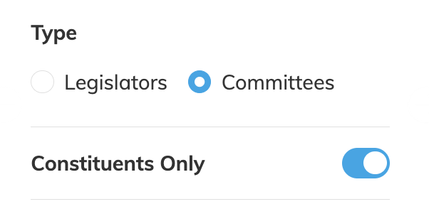 - Committees: Organizations targeting state committees/subcommittees can choose to remove the Constituency rule – allowing any advocate to send communication to the Committee member (One Click allows this because decisions made in Committee, will impact the entire state).
